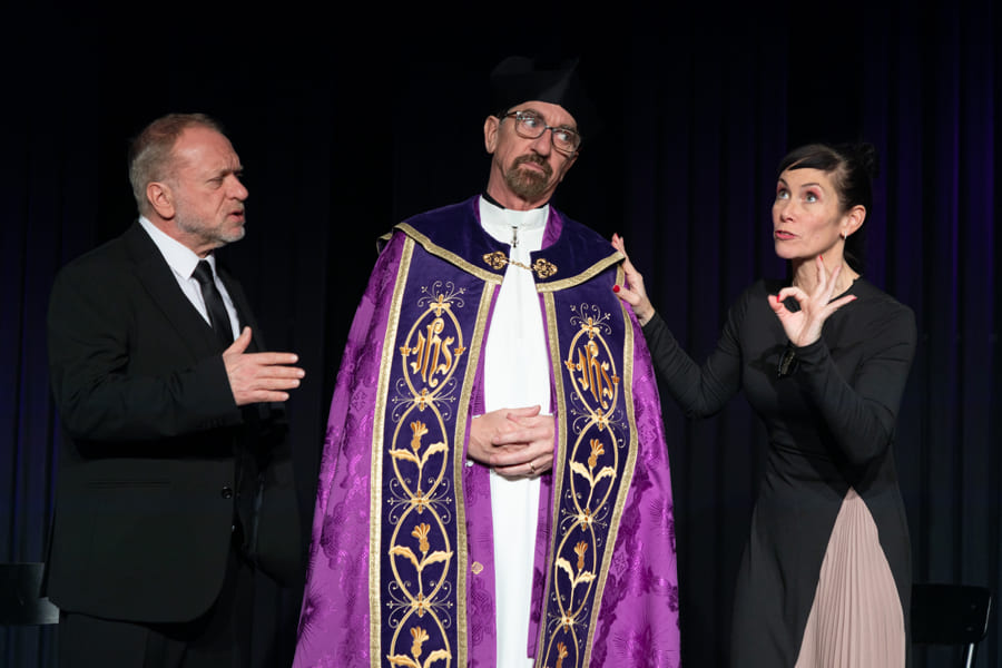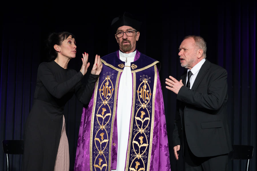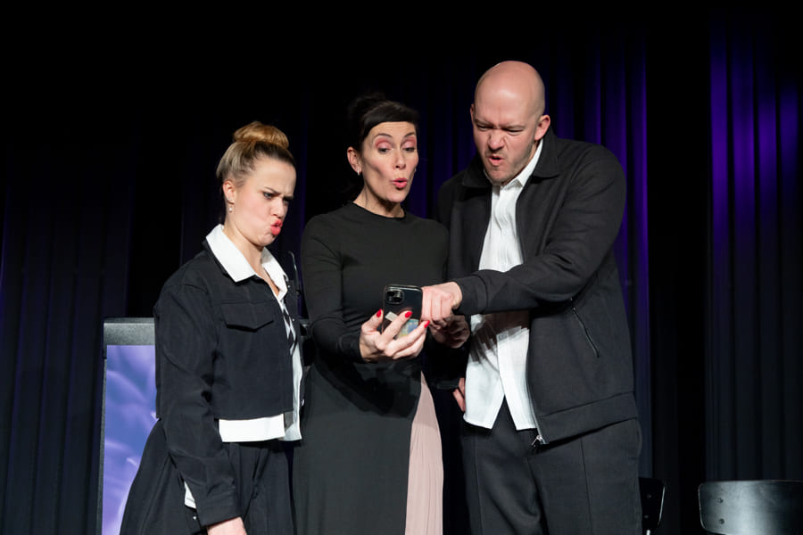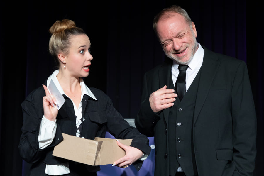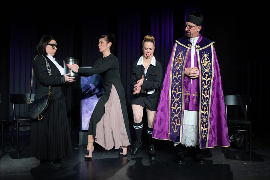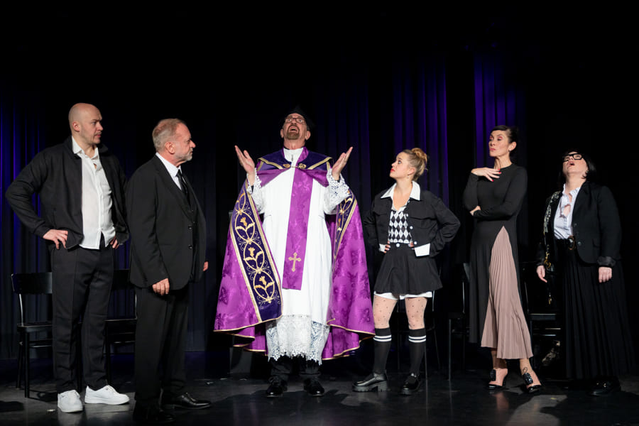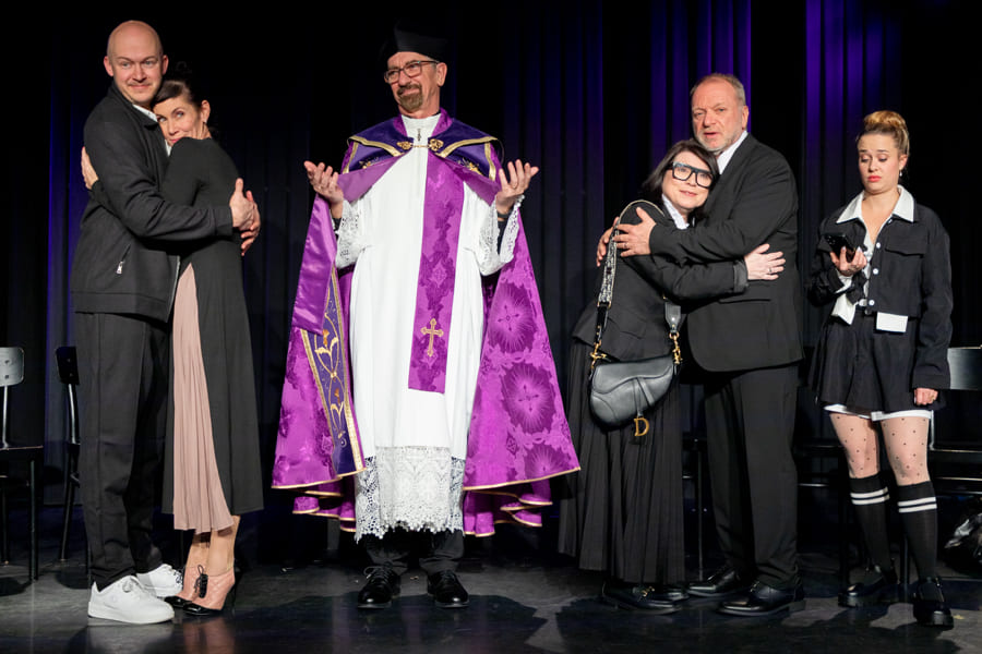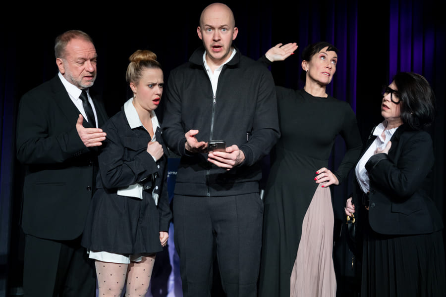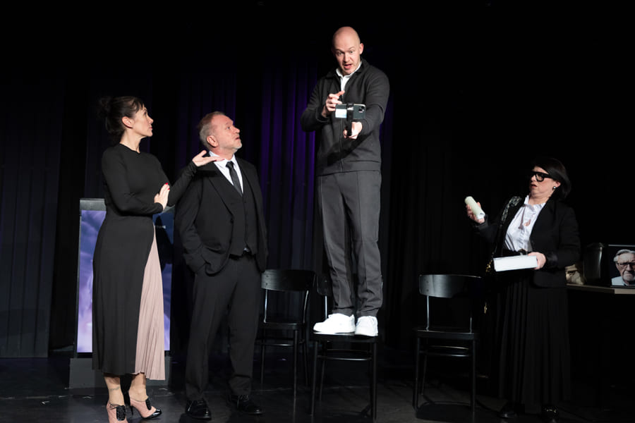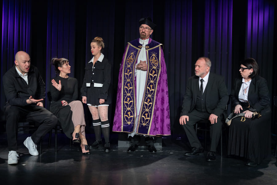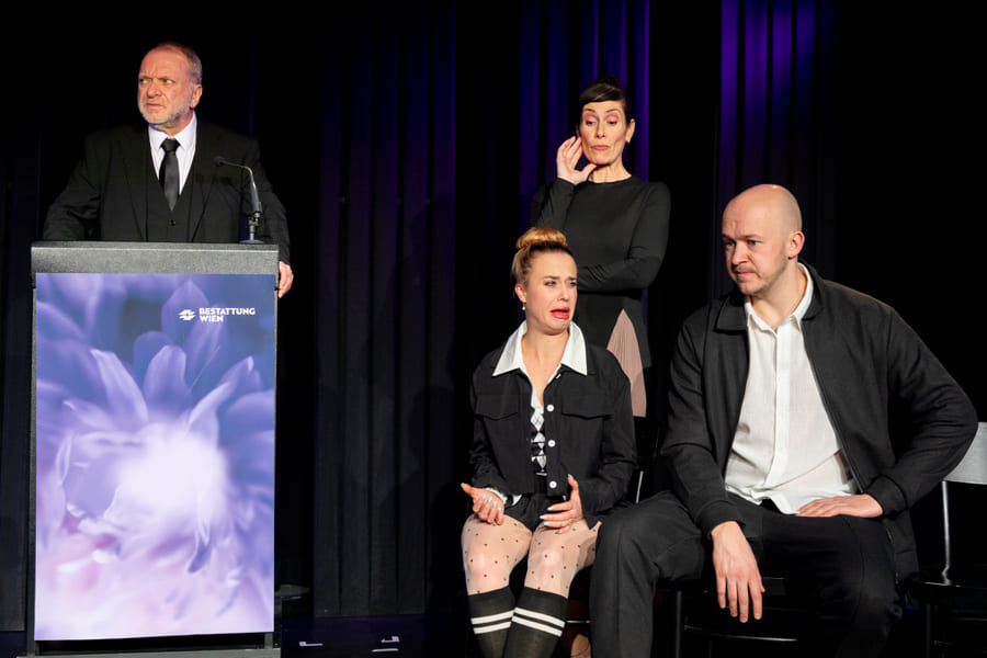 Schnell hat Hubert, der neue „Alte weiße Mann“ an der Spitze, nicht nur seine Marketing-Leiterin, den Social-Media-Chef und seine Sekretärin gegen sich, sondern auch die sehr selbstbewusste Praktikantin. Vor dem Theaterpublikum als versammelter Trauergemeinde zerfleischt sich in diesem hochpointierten Stück schließlich die Führungsetage der Firma immer mehr. Nicht einmal der verzweifelte Pfarrer kann die Wogen glätten.
